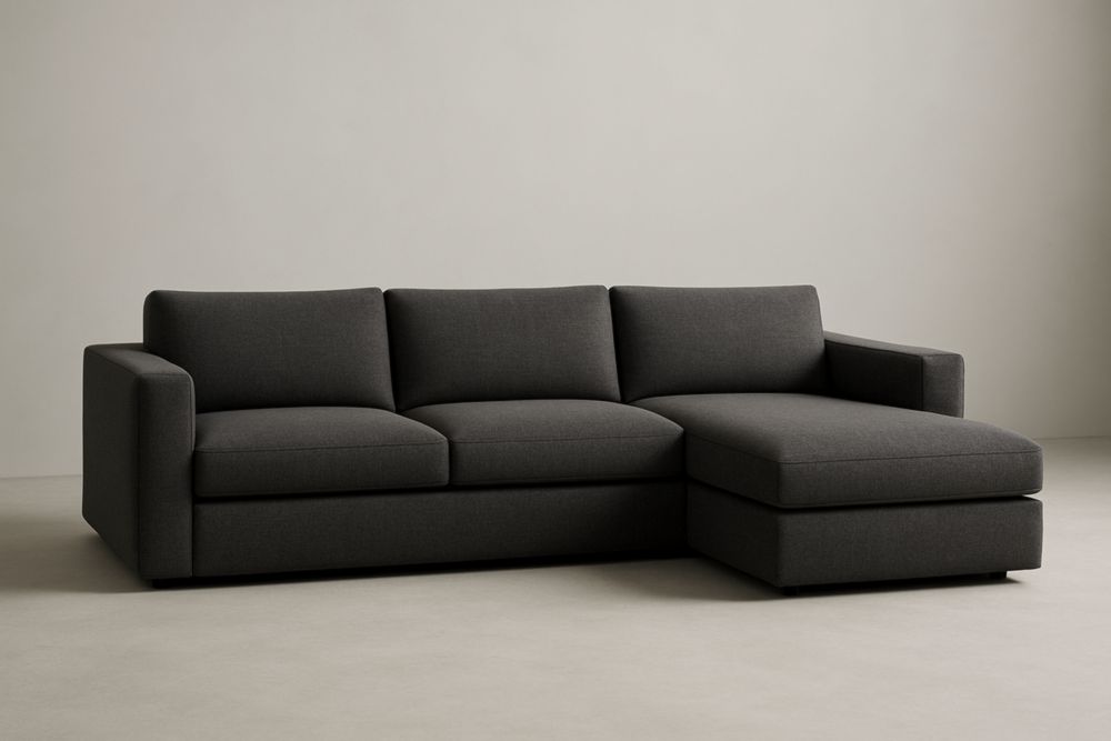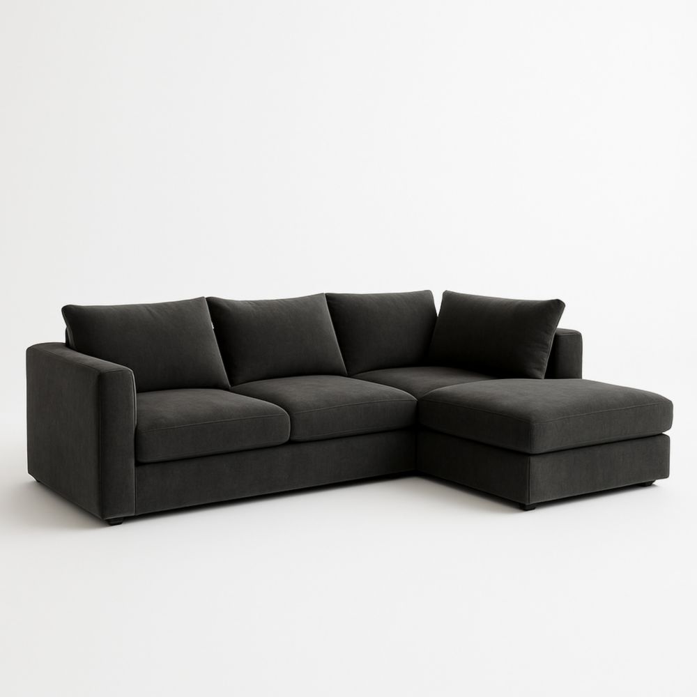 Divano angolare in tessuto grigio scuro con chaise longue