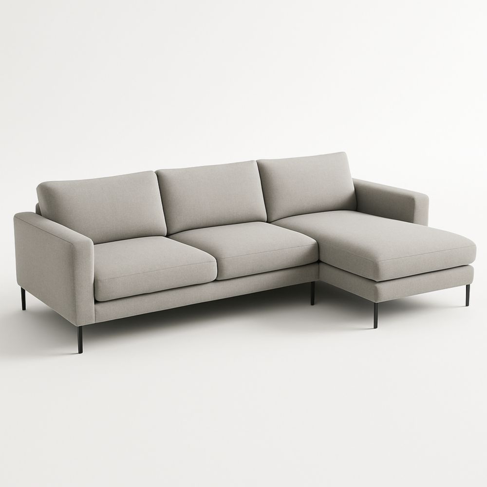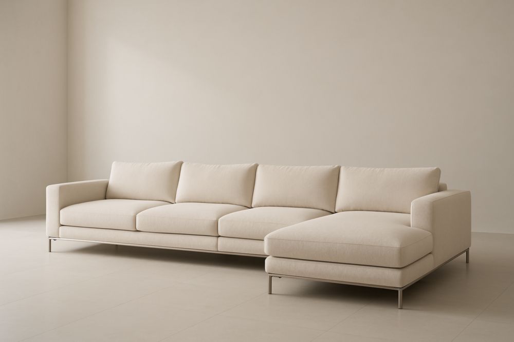 Divano angolare in tessuto beige con struttura in metallo