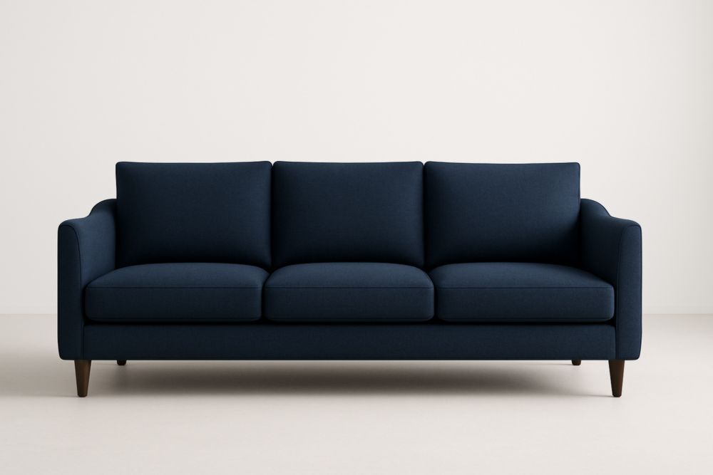 Divano a Tre Posti in Tessuto Poliestere Blu con Gambe in Legno