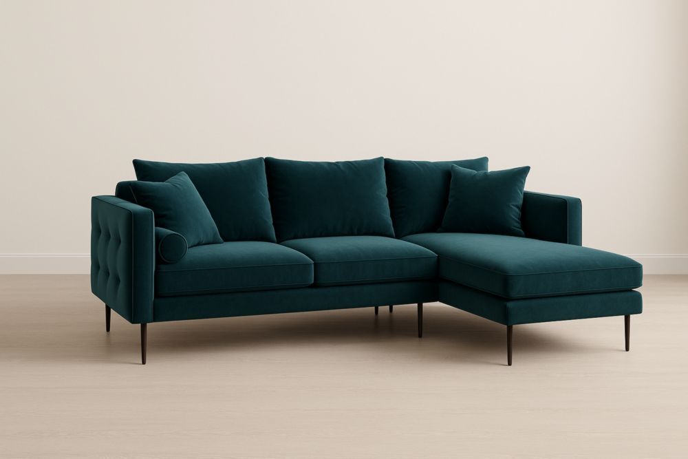 Divano angolare in velluto verde con gambe in metallo