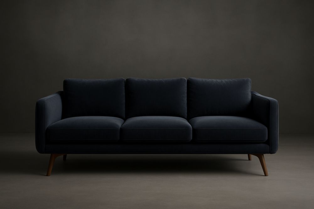 Divano Tre Posti in Velluto Blu Scuro con Gambe in Legno